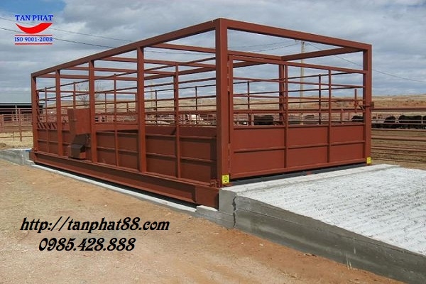 Cân sàn điện tử ứng dụng cân động vật. Cân sử dụng khung cân có 2 cửa ra vào tiện dụng. Hình ảnh cân dùng cho việc cân lợn trong các trang trại lợn.